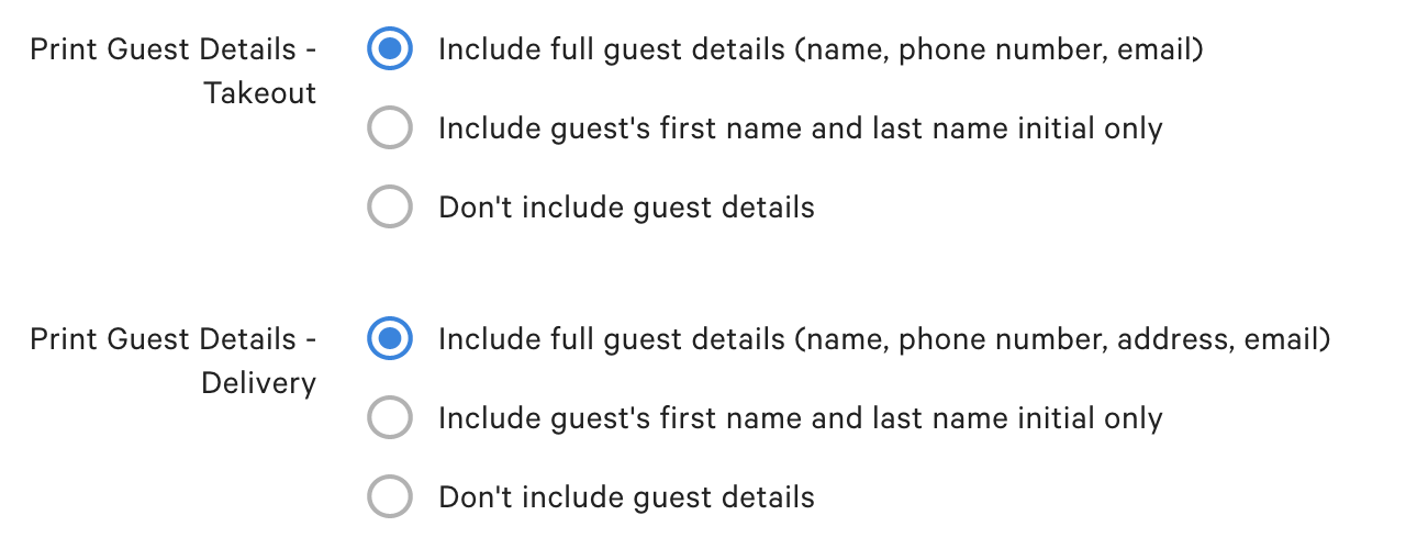 La información del cliente se puede configurar de manera diferente para Pedidos Comida para llevar o Envío. Esto puede ser útil si necesitas que tus Pedidos de Envío Impriman información más detallada que la de tus Pedidos de Comida para llevar.