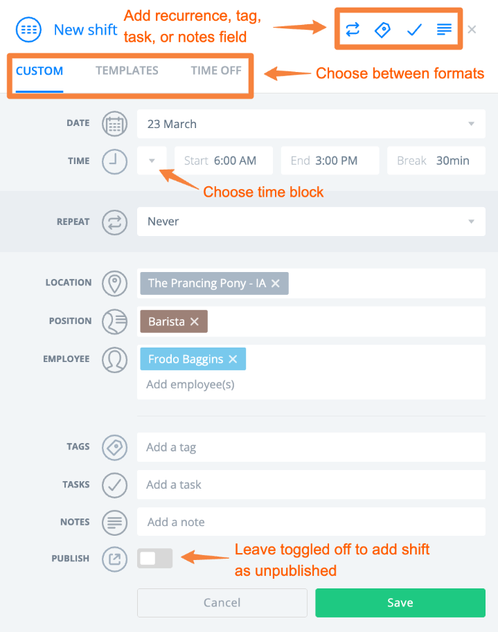 En la siguiente pantalla, ingresa detalles del turno, como bloques de tiempo, duración del descanso, recurrencia, etiquetas y notas. Puedes dejar el campo del empleado en blanco para crear un turno disponible o no asignado.