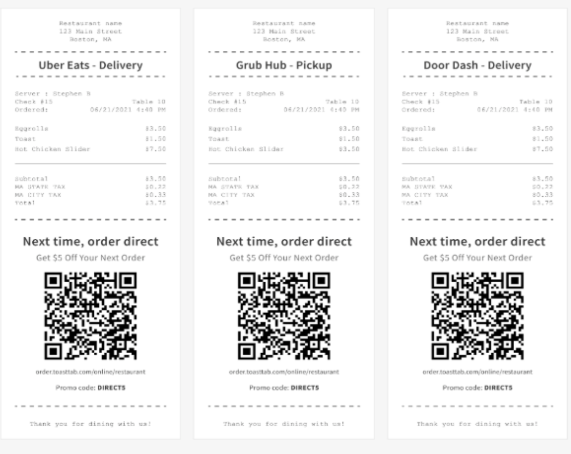 Si buscas agregar un código QR a los recibos de pedidos de terceros que publicitan los pedidos directamente a través de Pedidos digitales Toast, ve a Comida para llevar y Envío > Haz crecer tus pedidos digitales > Configura un código QR en los recibos impresos de aplicaciones de terceros. Puedes personalizar por completo todos los mensajes promocionales e incluso agregar una promoción a esta nueva sección QR en los recibos de terceros, o desactivarla por completo si lo prefieres. Esta configuración es recomendada, pero opcional, y solo se puede ver en copias de recibos dirigidas al cliente. El código QR no aparece en tu Ticket.