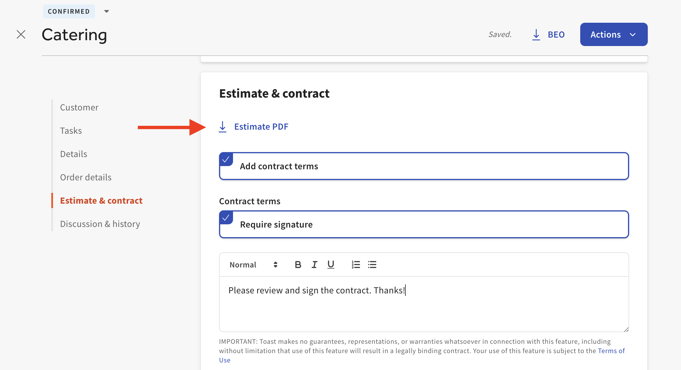 Puede descargar una copia firmada de la estimación del cliente navegando primero a Catering y Eventos en la barra de menú izquierda.
