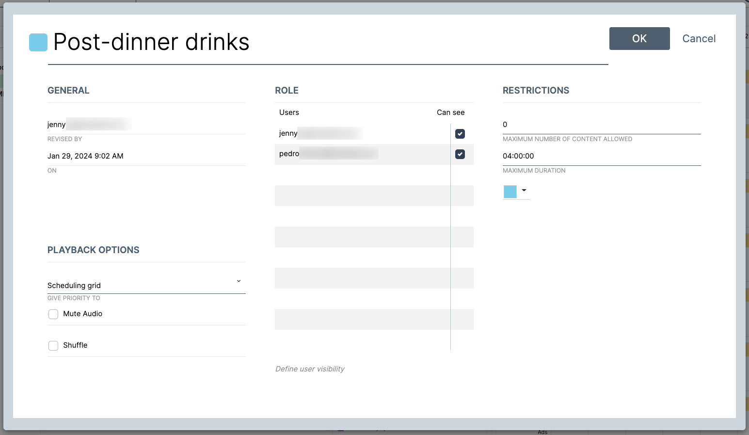 Las listas de reproducción siguen la misma regla de jerarquía que la biblioteca de contenido. Crear una lista de reproducción en el nivel superior significa que comparte la lista de reproducción con los niveles inferiores. Los cambios realizados en las listas de reproducción de nivel superior aparecen en todas partes donde se utiliza la lista de reproducción.