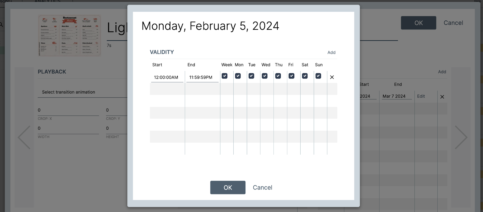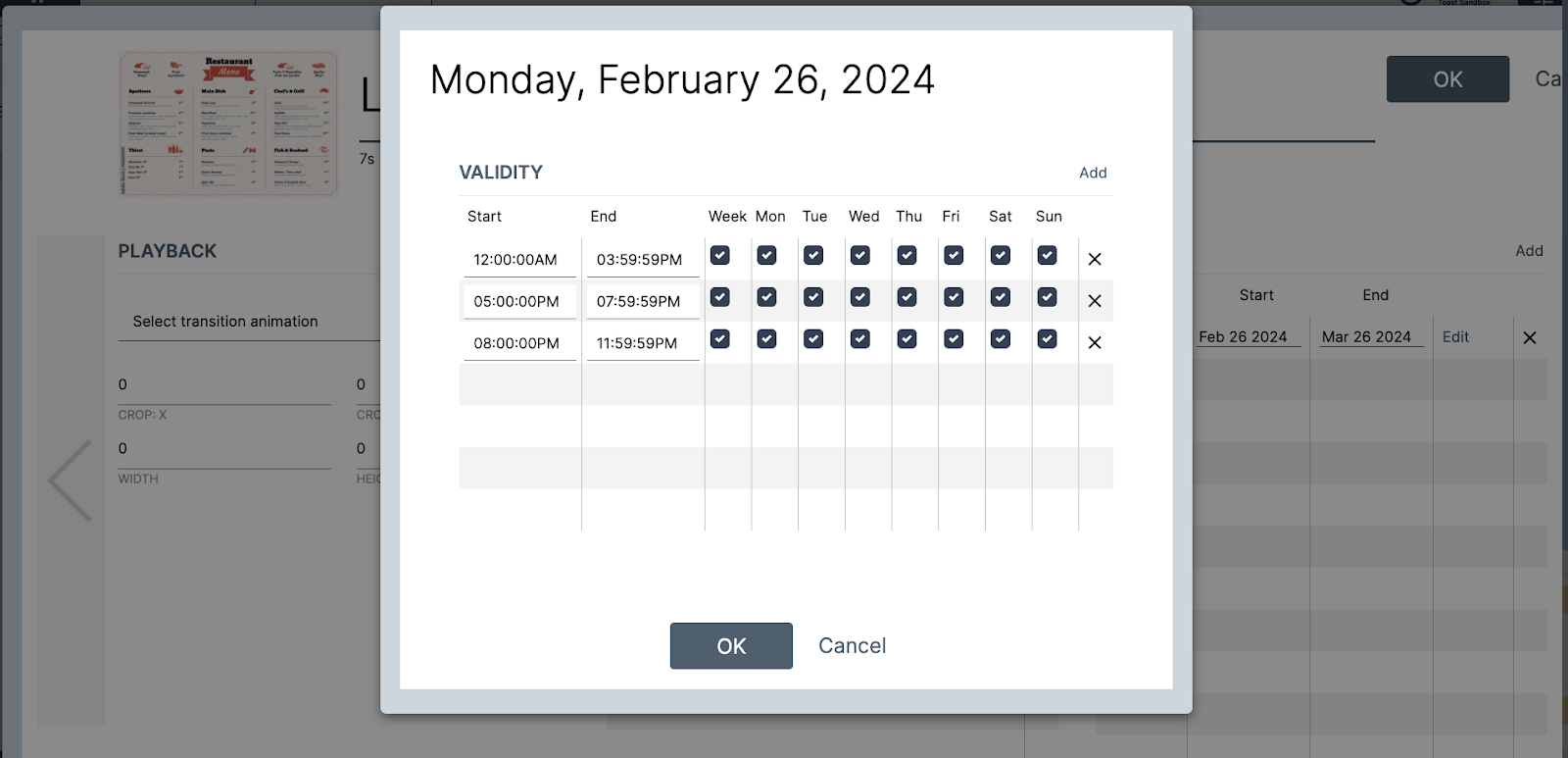 Si configuras tu período de validez, podrás precargar contenido o una lista de reproducción y hacer que solo se reproduzca en determinados días u horarios específicos. Por ejemplo, puedes tener un menú festivo configurado para reproducirse del 25 al 31 de diciembre, que termina a las 11:59 p. m. Puedes configurar esto para que se repita anualmente según sea necesario.