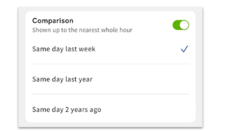Es posible que hayas activado la herramienta de comparación. Cuando se activa, la herramienta de comparación compara los datos del día actual con los de un día anterior de tu elección. Para ver el rango de fechas completo de datos, desactiva la comparación.