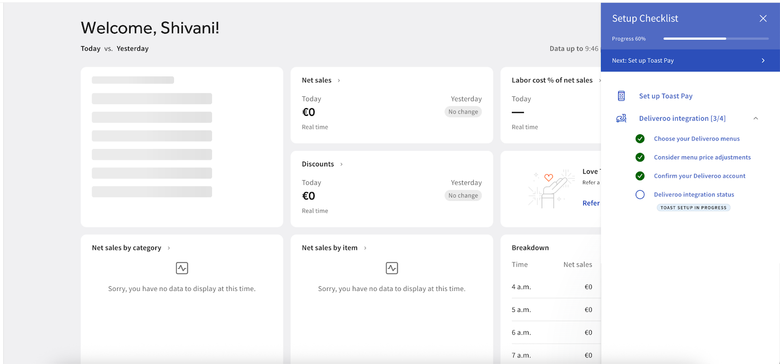 Puedes acceder fácilmente a los pasos de configuración en Toast Web cuando inicies sesión. Aparecerá una lista de verificación en la parte inferior derecha de la pantalla y habrá un apartado para la configuración de la integración.