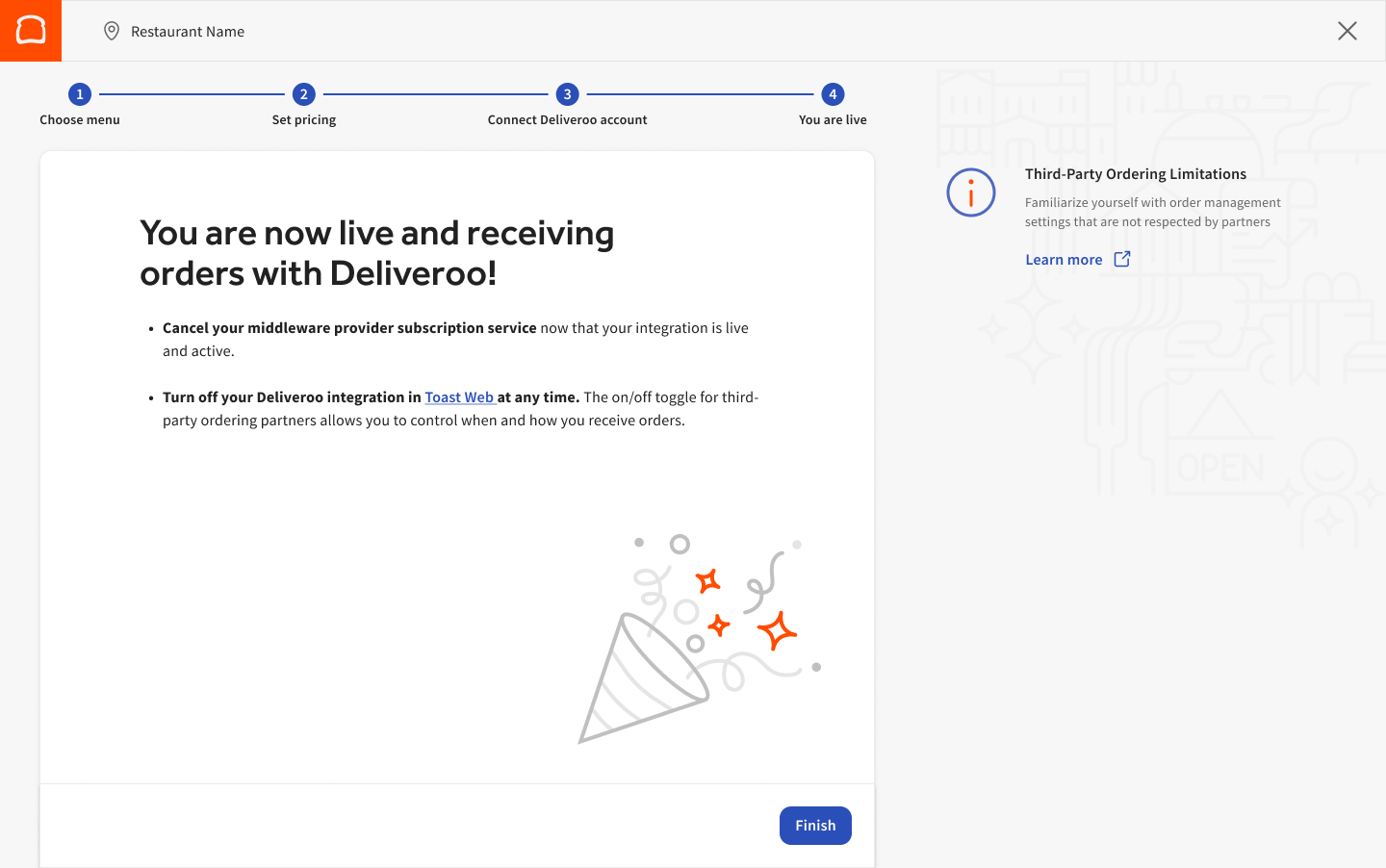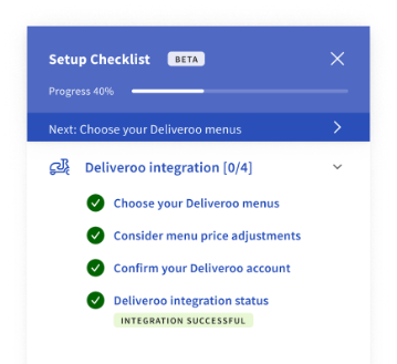 Estado de integración con Deliveroo: Configuración de Toast en curso. Nota: Debes completar la lista de verificación completa o tu integración no funcionará.