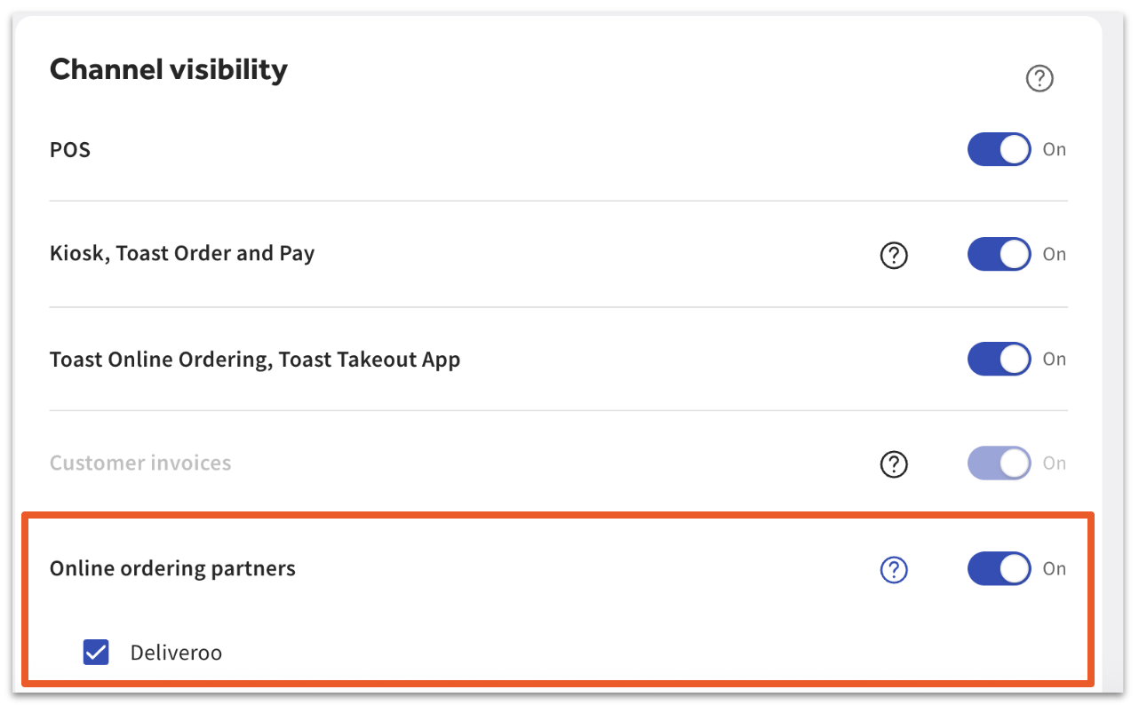 Una vez que esté activa la integración, debe realizar TODOS los cambios en el menú en Toast, NO en el portal de Deliveroo. Menús con visibilidad configurada en Pedidos digitales: Los socios de pedidos se muestran en Deliveroo y en los demás socios de pedidos digitales que puedes usar. Para obtener más información sobre cómo cambiar la configuración de visibilidad del menú, consulta menú.