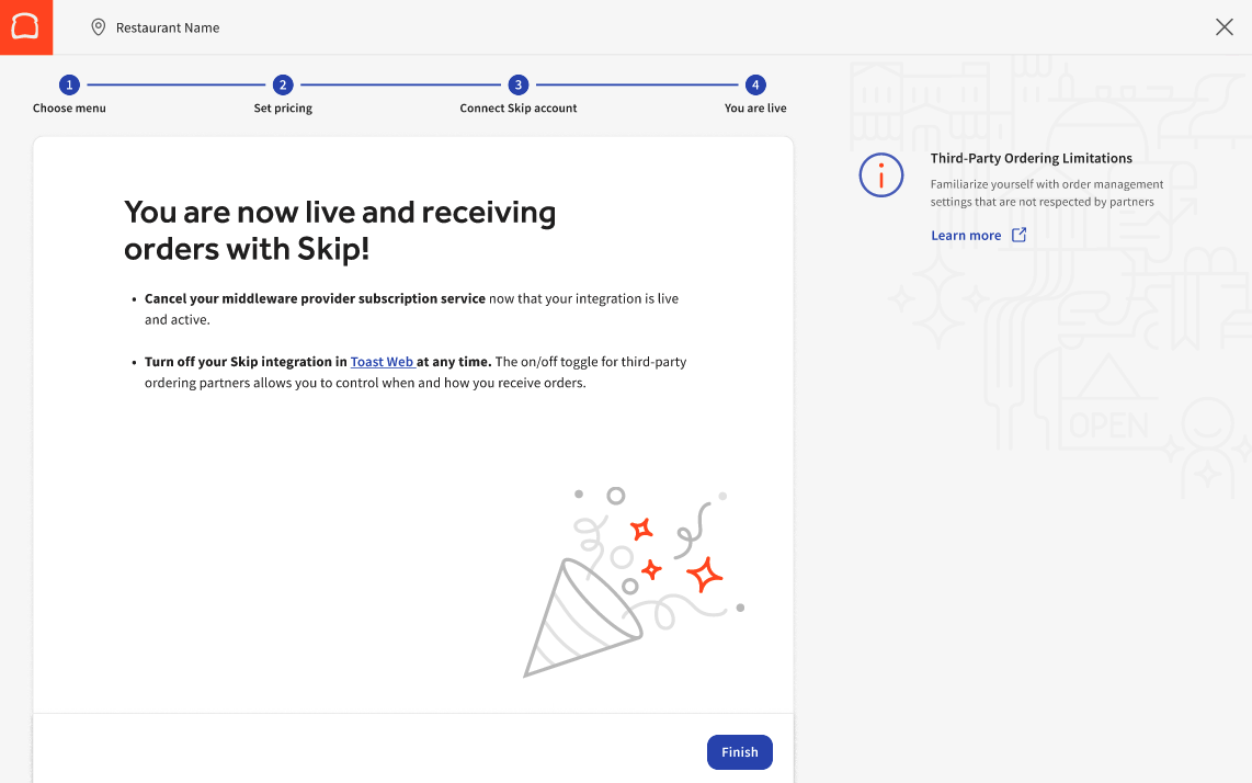 Debería esperar noticias de Skip dentro de 1-2 semanas. Si no ha recibido noticias de Skip después de 1-2 semanas pero ha recibido un correo electrónico de confirmación de Toast de que la configuración se configuró y se pasó a Skip, comuníquese con la atención al cliente de Toast.