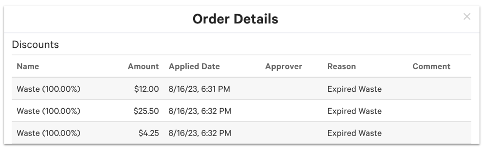 Para revisar los detalles de la cuenta y ver los motivos de residuos, puedes ir a Informes > Ventas > Pedidos y seleccionar el número de pedido que coincida con el número de cuenta de residuos en el POS. Si te desplazas hacia abajo, verás los motivos del descuento listados debajo de los detalles del pedido: