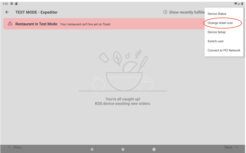 Después de habilitar la vista de cuadrícula, se te pedirá que elijas un tamaño de ticket. Si eliges salir del aviso, se te asignará por defecto tamaños de tickets medianos. Siempre puedes cambiar el tamaño usando la configuración de Cambiar tamaño de ticket dentro del menú de desbordamiento (tres puntos verticales) en la esquina superior derecha de tu KDS.