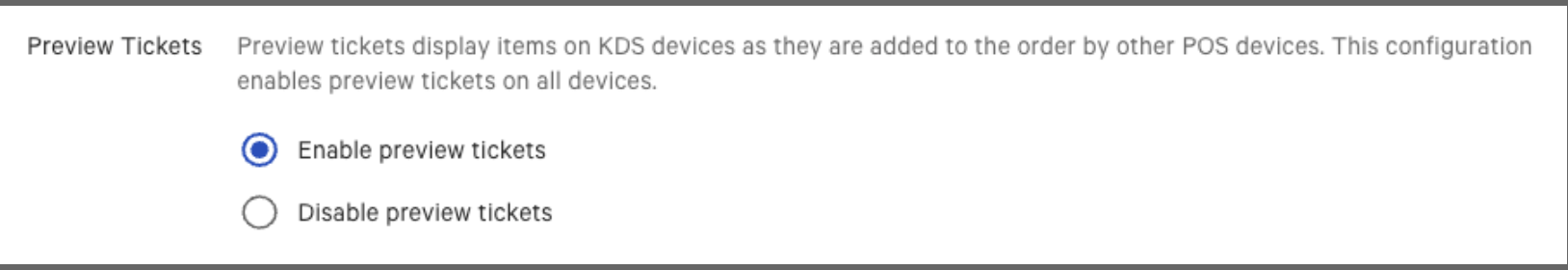 Dado que los tickets de vista previa ya no están activados por defecto, deberán habilitarse en Toast Web. Para configurar su dispositivo KDS para mostrar tickets de vista previa, siga estos pasos:
