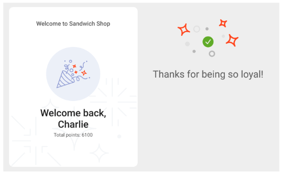 Con el programa de fidelidad de terceros en la pantalla expuesta al cliente, los clientes tienen la opción de iniciar sesión y canjear las recompensas ganadas cuando se registran, mientras su pedido está en curso, o después del pago.