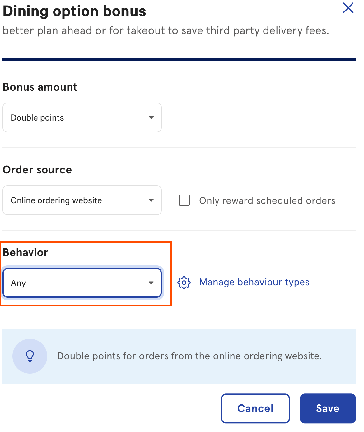 Si deseas configurar una bonificación de opción de comida y quieres que todos los pedidos en línea (tanto de entrega como de comida para llevar) reciban el doble o el triple de puntos de bonificación, selecciona Cualquier en el menú desplegable de Comportamiento.