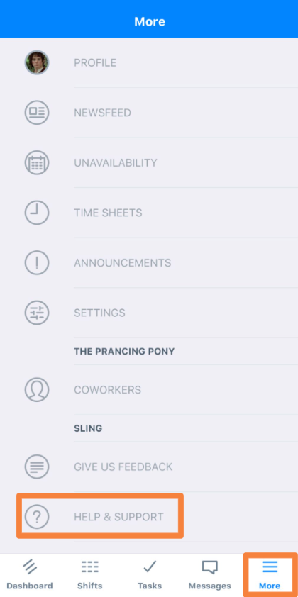 Select More in the bottom menu, then select Help & Support to start a conversation with the Support team.