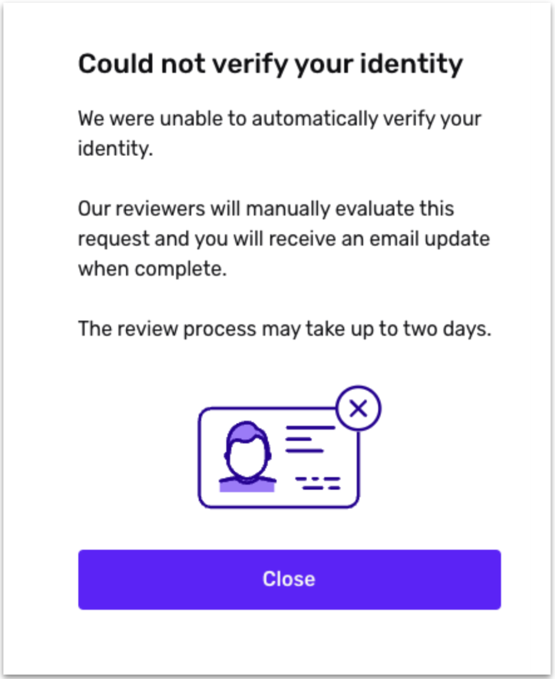 Nota: Si recibes el mensaje "No se pudo verificar tu identidad" a continuación, puede ser debido a múltiples intentos fallidos de carga u otros problemas de verificación. Este mensaje significa que la identidad no verificada será revisada por el equipo de Toast. El equipo revisará tu verificación dentro de dos días hábiles y puede aprobarla o rechazarla manualmente. No es necesario contactar al Servicio al Cliente.