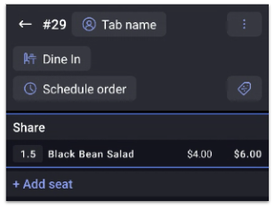 Cuando el artículo se selecciona en el POS, aparecerá un teclado numérico para ingresar la cantidad deseada. La verificación mostrará la cantidad a la izquierda del nombre del artículo del menú. A la derecha del nombre, se mostrará primero el precio por unidad, seguido del costo de la cantidad seleccionada. En este ejemplo, la cuenta muestra que se pidieron 1,5 unidades (libras) de ensalada de frijoles negros. El precio básico era de USD 4,00 por libra, por lo que el costo total de 1,5 libras es de USD 6,00.