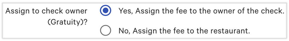 1. Si seleccionas , este cargo de servicio se configurará como gratificación y se destinará al propietario de la cuenta. Cuando el cargo de servicio se destina al propietario de la cuenta de esta manera, el aviso de propina en el recibo digital siempre mostrará las opciones de propina 3 %, 5 % y 7 %.