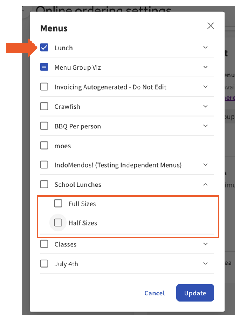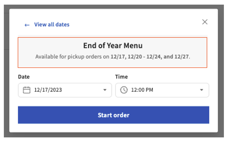 Apague o encienda los elementos del menú de Pedidos en Línea de Catering según la estacionalidad o las ocasiones especiales, y solo admitimos menús completos.