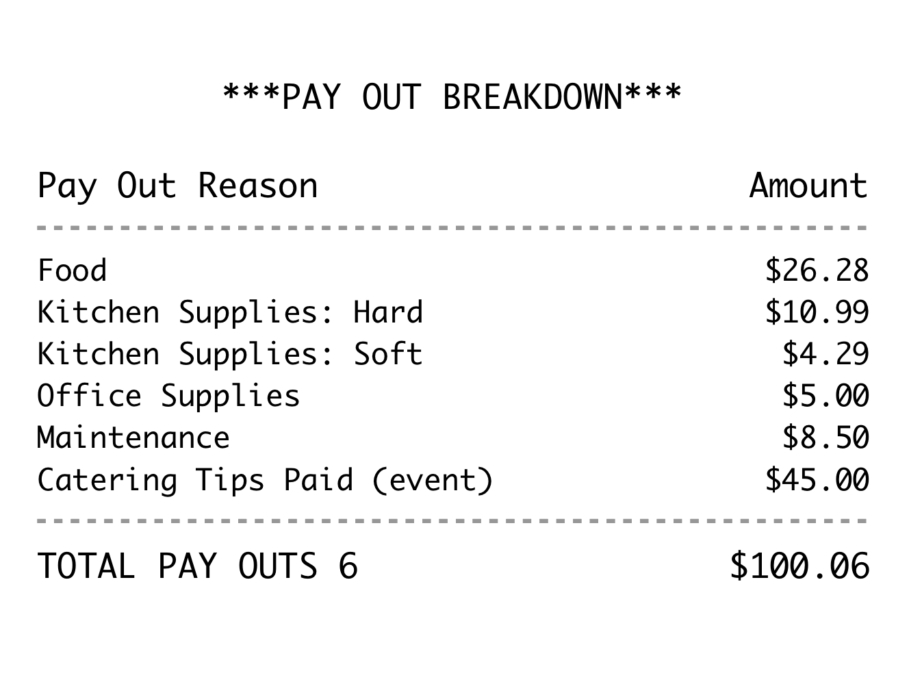 Actualmente, los detalles de sus desembolsos no están disponibles en el Informe de Resumen de Ventas. Sin embargo, puede configurarlo para que aparezca en su Informe Z de fin de día. Este desglose de desembolsos mostrará una lista detallada y el monto de cada desembolso que se emitió.