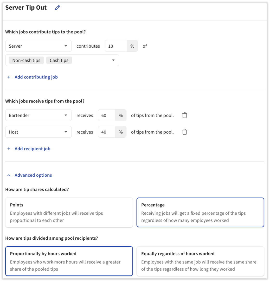 | Tengo muchos trabajos dentro de mi restaurante | Los puntos te permiten crear una proporción de distribución entre tus diferentes títulos de trabajo. | Los porcentajes te permiten distribuir cantidades fijas a cada trabajo. La cantidad porcentual no es lo que cada persona recibe; más bien, es lo que todos los que están registrados en ese trabajo dividirán entre sí. |