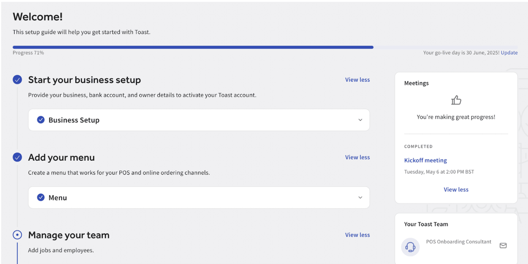 Después de completar la instalación de los equipos de Toast, la configuración web de Toast y la creación del menú, es hora de consultar a tu director de proyectos y tu director de proyectos de menú.
