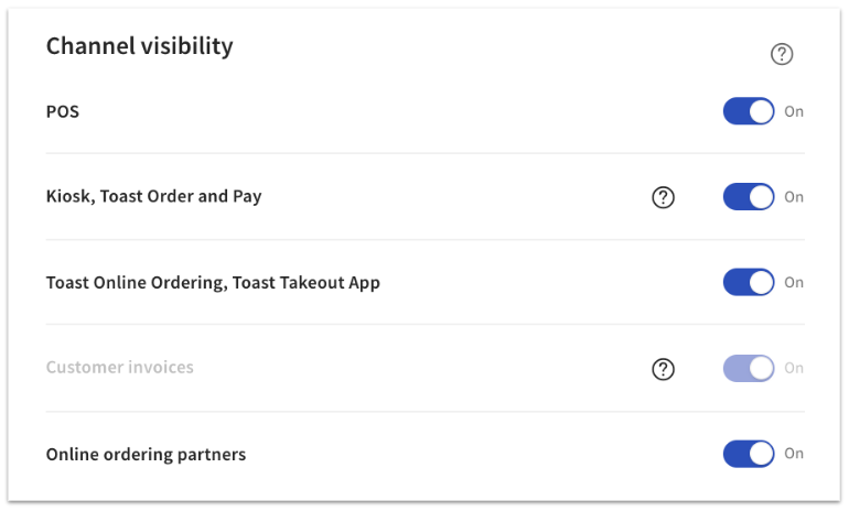 Nota: A diferencia de las tasas de impuestos y las estaciones de preparación, la configuración de visibilidad del canal no te permite vincular y desvincular la configuración de un grupo de menús o elementos a su menú o grupo de menús padre. Si un elemento de menú o grupo de modificadores pertenece a un menú o grupo de menús que está oculto de la vista para cualquiera de los canales de Toast, entonces el elemento o grupo de modificadores también estará oculto de esos canales.