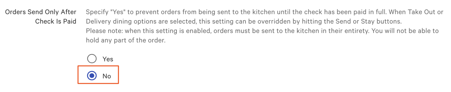 Una configuración adicional evitará que los pedidos de Toast Mobile Order & Pay® se impriman en la sección Otra Configuración de Toast Web. Si la configuración Los pedidos se envían solo después de que se paga la cuenta está configurada en Sí, entonces tus pedidos no se enviarán a tu cocina cuando se realicen a través de Toast Mobile Order & Pay® y usando cuentas. Para ajustar esta configuración: