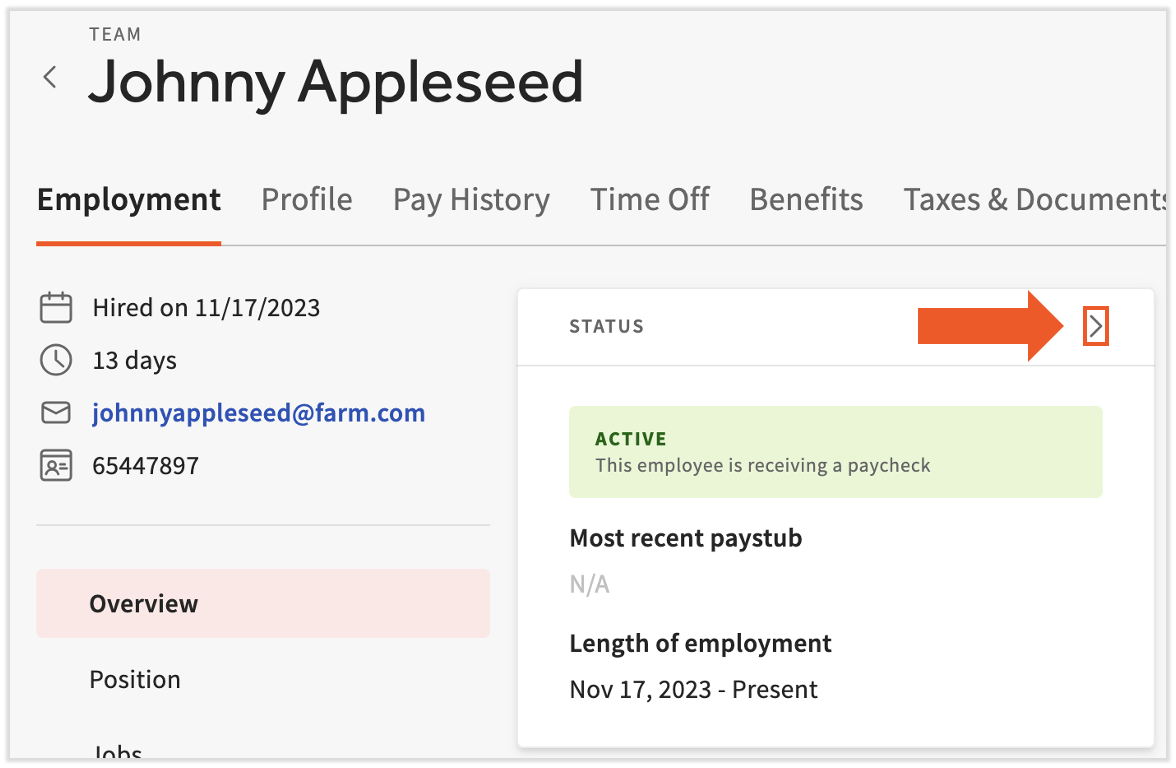 Para revisar a la persona que despidió a un empleado en Toast Payroll (que archiva un perfil en Toast Web), abre Toast Payroll y navega al perfil del empleado. Selecciona el > ícono de caret en la parte superior del mosaico Estado. Cierra la ventana emergente y verás el cambio de estado auditado. Revisa la columna Usuario para la entrada Despedido.