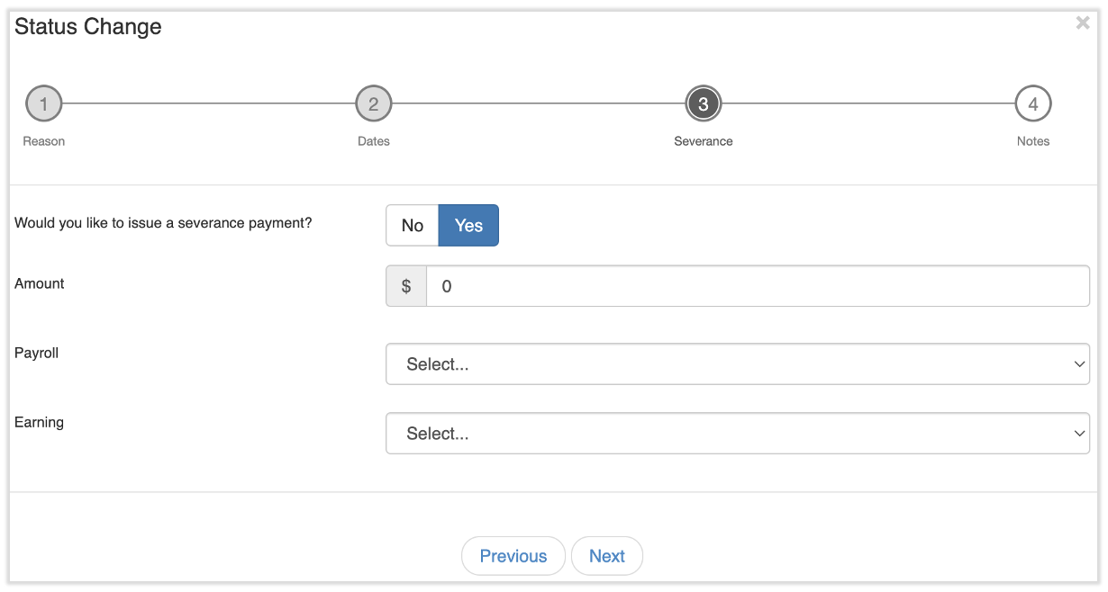 En este paso, si ¿Te gustaría emitir un pago por despido? está configurado en Sí, entonces aparecerán opciones adicionales. Ingresa el monto, la nómina y el código de ganancias a los que debe aplicarse el despido y selecciona Siguiente. Si esto está configurado en No, simplemente selecciona Siguiente para continuar.