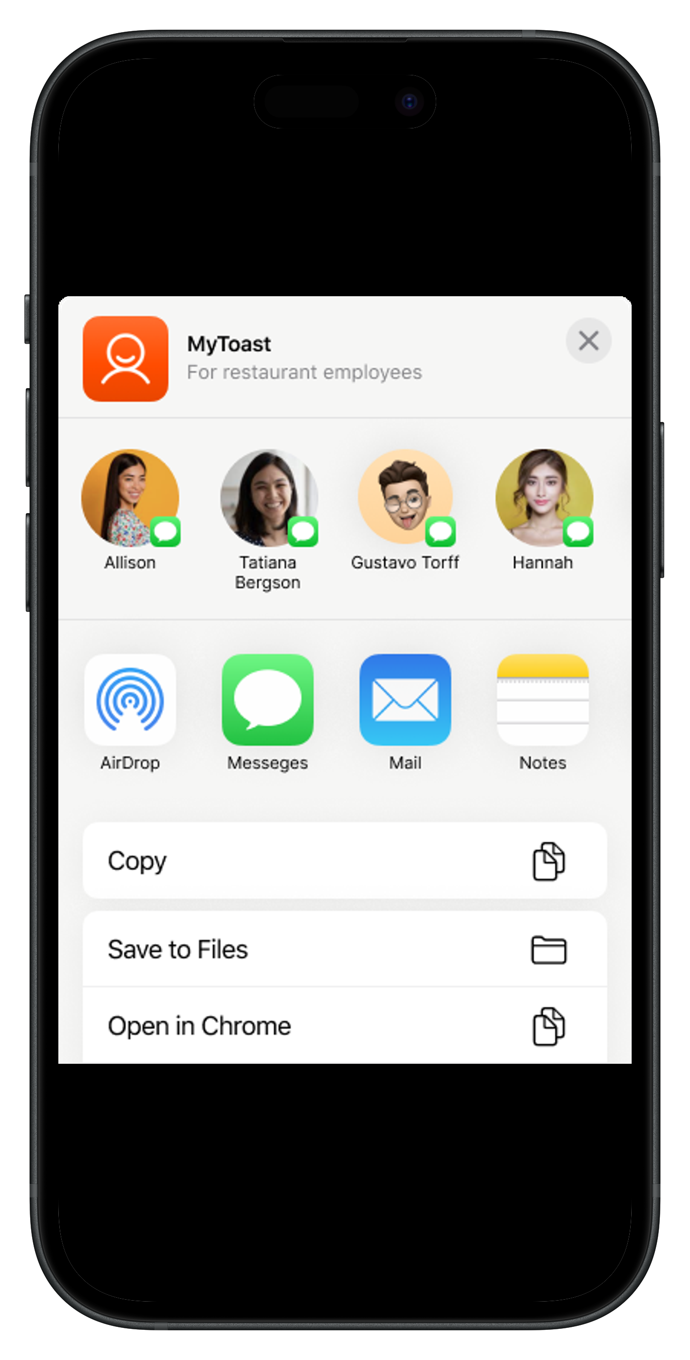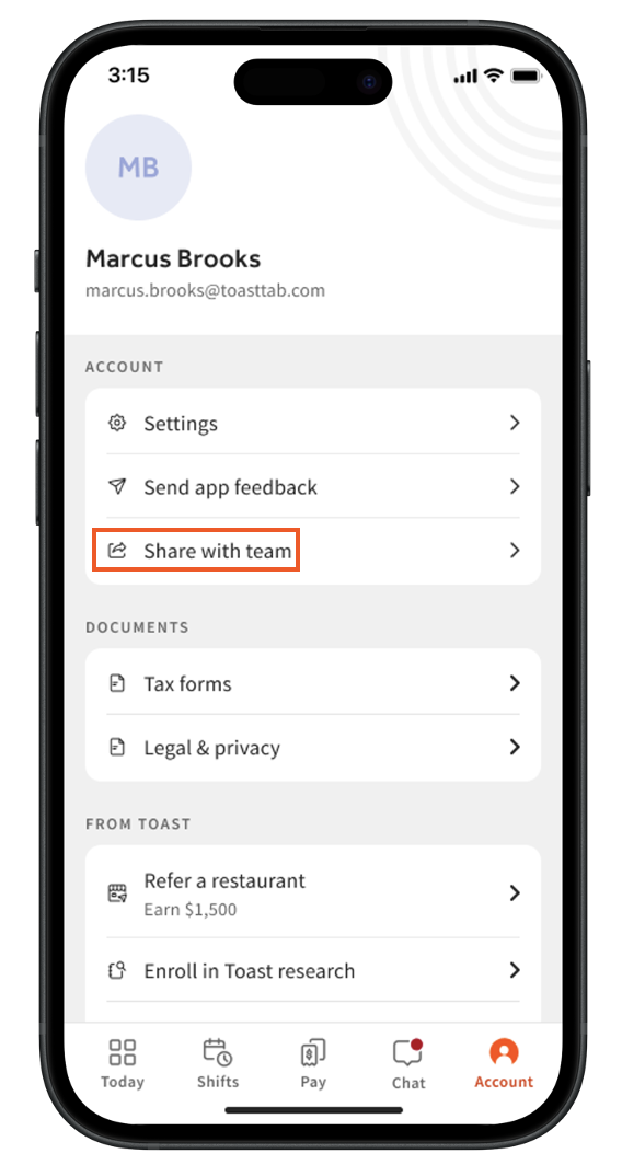 Queremos conocer tu opinión. En la pestaña Cuenta, los empleados y gerentes pueden seleccionar Enviar comentarios sobre la aplicación para decirle a Toast lo que te gusta y no te gusta de la aplicación MyToast. Lamentablemente, no podemos incorporar todos los comentarios que recibimos, pero los tenemos en cuenta a todos, y nos esforzamos para lograr tener la mejor aplicación posible. Gracias por hacernos llegar lo que piensas.