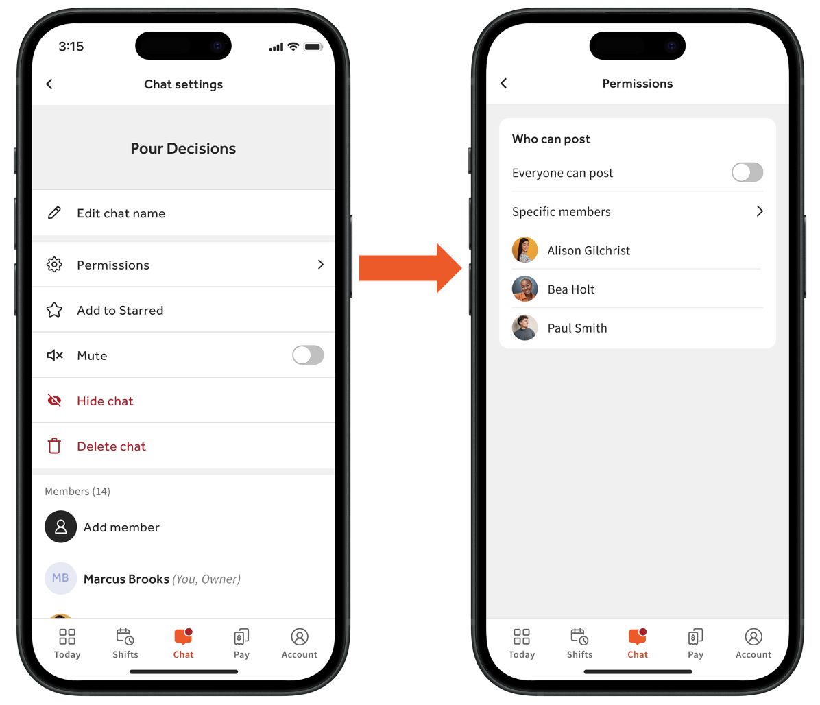 Los administradores de chat (típicamente gerentes o propietarios/operadores de restaurantes) usarán el permiso 3.30 Controles avanzados de chat grupal para las siguientes funciones: