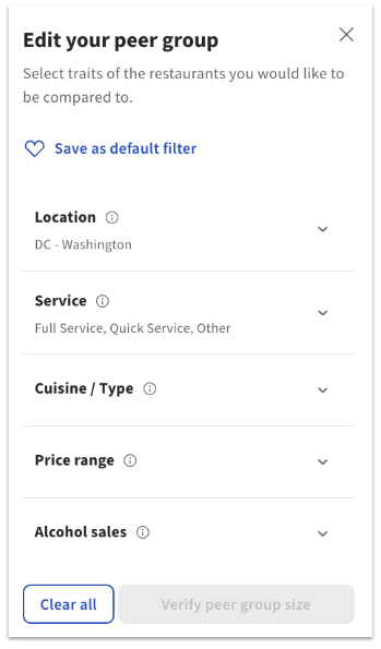 | Selección de grupo de pares | Limitado a la selección de la ubicación y el servicio. | Puede seleccionar un grupo de pares en función de la ubicación (por ejemplo, por código ZIP), el servicio, la cocina o el tipo, el rango de precios y sus ventas de bebidas alcohólicas