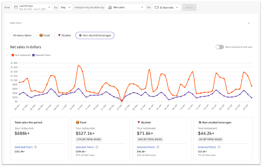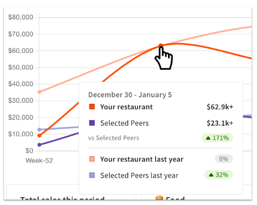 Debajo del gráfico verás fichas resumidas de las ventas totales, las ventas de alimentos, las ventas de bebidas alcohólicas y las slaes de bebidas sin alcohol para tu negocio y tus pares seleccionados durante el período de tiempo elegido.