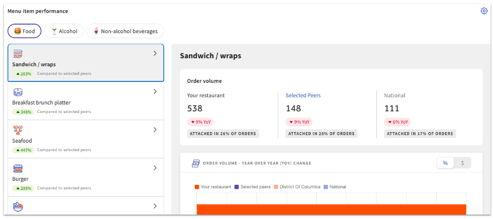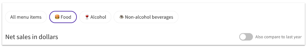 En la parte superior del gráfico hay botones que te permiten ver Todos los artículos del menú, Solo comida, Solo alcohol o Solo bebidas sin alcohol.