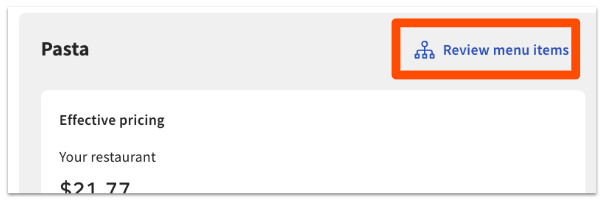 La sección Análisis comparativo de precios eficaces de la descripción general del restaurante de análisis comparativo te muestra cómo tus productos más vendidos se comparan con tus pares seleccionados el mes anterior. Esto puede incluir lo siguiente: