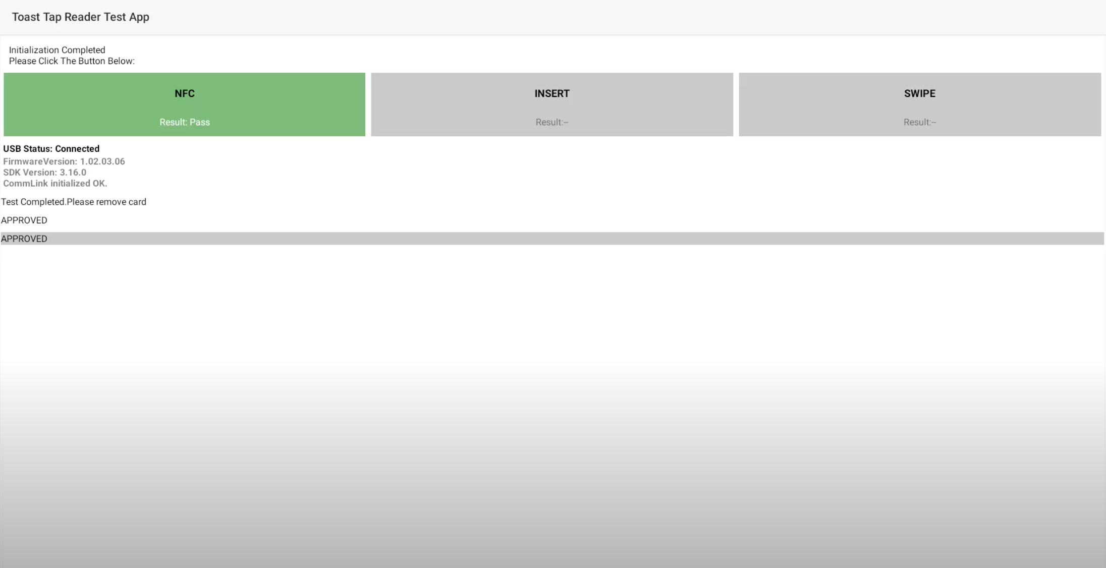 Si Toast TapTM pasó los pasos de solución de problemas anteriores y no está dañado, pero aún no puede procesar pagos, sigue los pasos a continuación para probar el pago con una aplicación de prueba del lector de tarjetas en tu dispositivo.