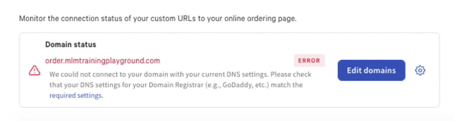 Cuando conecte su dominio a su sitio web de Toast, podrá ver los DNS (Configuraciones del nombre de dominio) que Toast está recibiendo del proveedor de dominio, lo que le ayudará a identificar cualquier error.