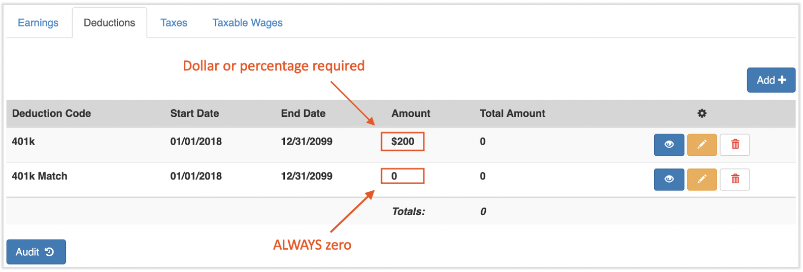Employer matches will only populate on a fullycalculated payroll. Employee profiles, quick calc entries, and the payroll spreadsheet will always show zero amounts.