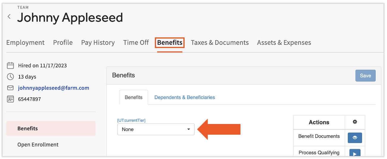 Some employer matches are unique to specific groups of employees. If this is the case for your rules, check to make sure the correct benefit tier is assigned to the employee's profile. From the employee's profile, navigate to Benefits. Update the first dropdown menu with the correct benefits tier and confirm the details on the following pop-up. Then select Save from the upper-right corner to apply the updated tier.