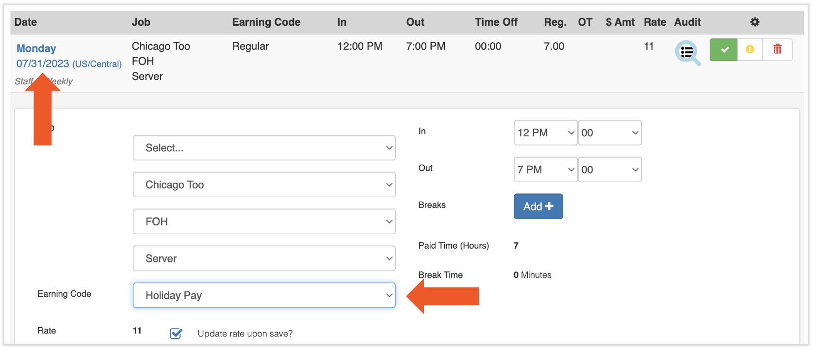 Una vez que haya agregado días festivos/eventos de la empresa al calendario, se deben agregar reglas para que las horas de vacaciones se registren en las hojas de tiempo. La forma en que se configuran dictará cómo aparecen estas horas en las hojas de tiempo. Toast Payroll puede manejar el pago de días festivos de dos maneras: