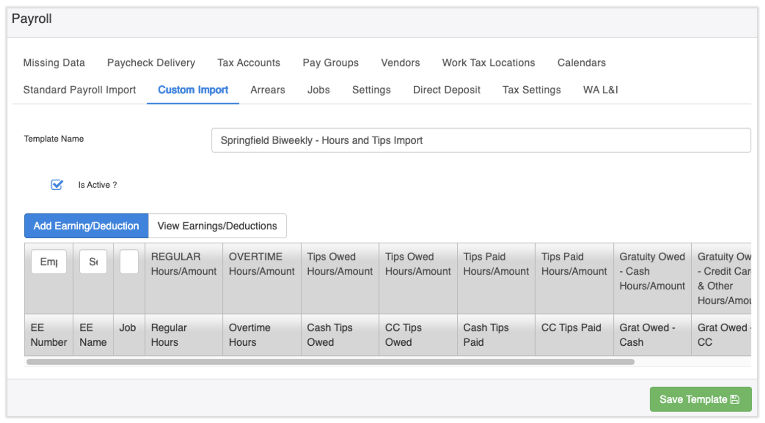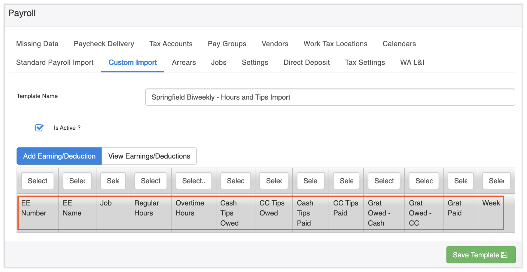 Considera nombrar tu plantilla como algo memorable, como “grupo de pago” “frecuencia de pago” - importación de propinas (p. ej., Springfield quincenal - importación de propinas).
