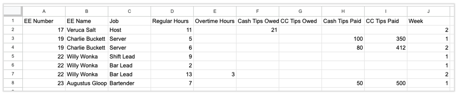 Semana 2: Si tienes una nómina quinquenal o quincenal, algunas de tus propinas e ingresos se cobrarán en la segunda semana del período de pago. Cuando suceda, ingresa un 2 en esta celda. Si tus empleados han trabajado durante todo el período de pago, tendrás más de una línea por persona y semana (ver imagen a continuación).