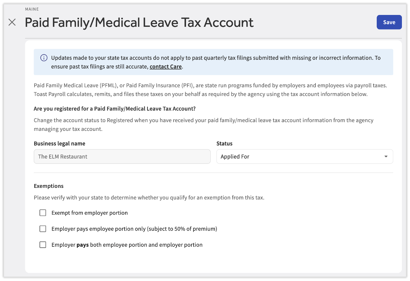 Registro en el estado Configura tu cuenta PFML, identificada por un número de identificación. Este número permite que Nómina Toast presente la declaración electrónicamente en tu nombre. Si no proporcionas esta información, se corre el riesgo de que Nómina Toast pueda remitir o presentar tu declaración en tu nombre, lo que puede derivar en sanciones financieras para tu empresa.