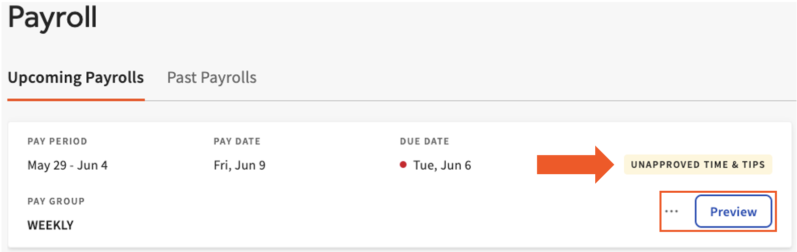 Se mostrará el número de propinas u hojas horarias no aprobadas para avisarte si no estás listo para procesar la nómina.