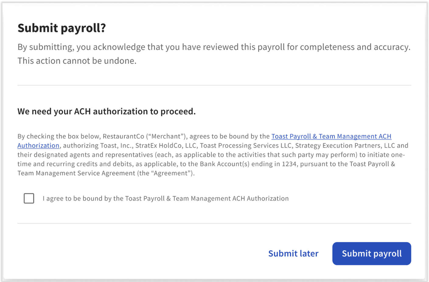 Nota: Si esta es tu primera nómina o si recientemente cambiaste la cuenta bancaria de tu empresa registrada, verás un mensaje único alternativo que indica que Nómina Toast necesita tu autorización para realizar transacciones ACH con la cuenta bancaria de tu empresa. Para continuar, selecciona la casilla de verificación y presiona Enviar nómina.
