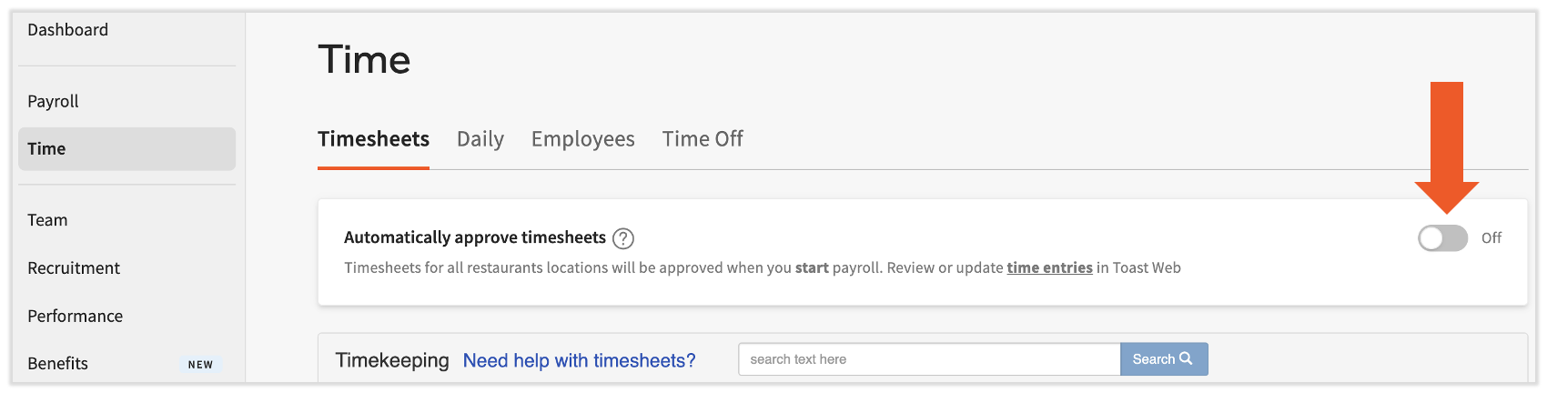 Antes de comenzar a ejecutar la nómina, es posible que debas aprobar plantillas horarias para tu personal. Ve a Tiempo y toma nota del botón de activación en la parte superior. Si está activada, las entradas de tiempo de Toast Web aparecerán automáticamente en el paso Ganancias del empleado de la nómina (paso 5). Si se desactiva el selector, recomendamos filtrar la página al período de pago actual para aprobar plantillas horarias (usa el menú desplegable encima de la columna Nómina). Consulta Nómina para obtener más información.