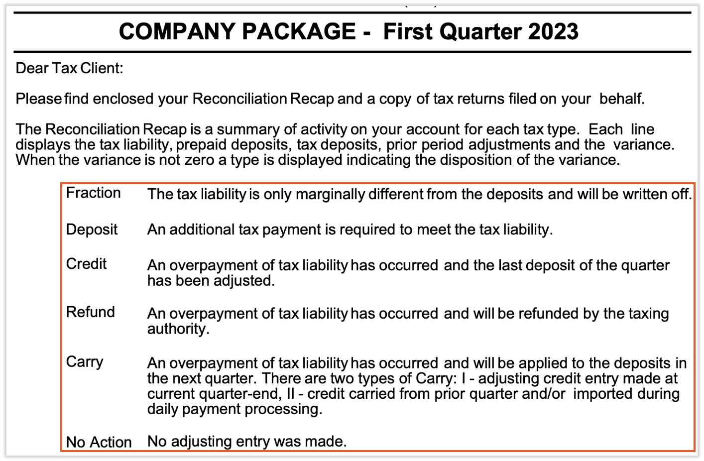 It is very important to review this section to ensure that your filings have gone through and that information in certain columns is correct. If not, it could result in penalties or interest charges from tax agencies. To review this, scroll to the very last document in your quarterly tax package.