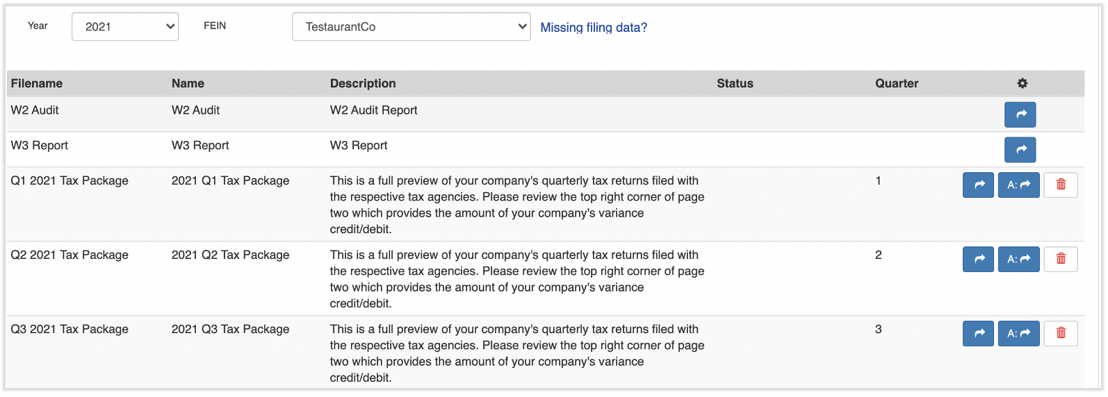 Otherwise, you can always find all your historical quarterly tax packages by navigating to Reports > Tax Filing. First, use the Year and FEIN drop-down menus, then select the blue arrow button to view and download the files.