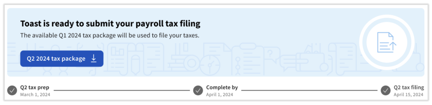 A quarterly tax package is a set of documents that contain all tax documents and returns filed with state and federal tax agencies on your behalf by Toast Payroll. Federal forms 940, 941, and (when appropriate) 944 can be found in the quarterly tax package. When a tax package is available, an notification email is sent out to the last individual who submitted payroll. Quarterly tax packages are typically available the third full week of the month following quarter-end.