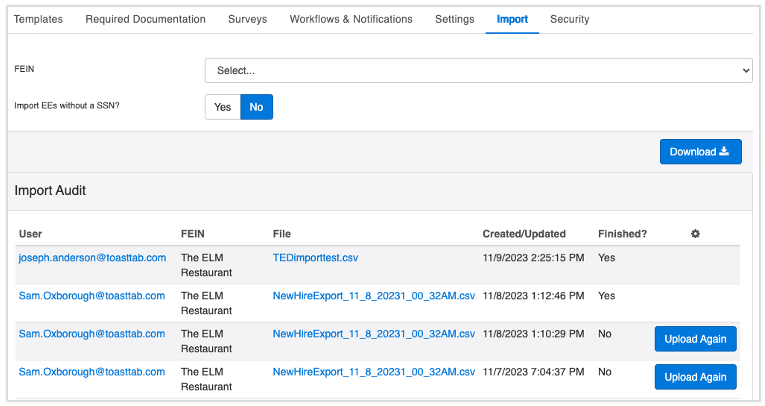 Una vez completada la información, deberás seleccionar el FEIN en el menú desplegable Importar página e indicar si quieres importar empleados con o sin SSN. Una vez completada la opción FEIN y SSN, selecciona Elegir archivo para cargar el archivo de la plantilla de nuevos empleados completado.