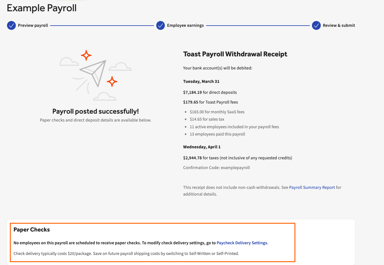 | Estos métodos solo se aplican a los empleados que no reciben depósitos directos ni usan Toast Pay Cards y, en su lugar, recibirían un cheque en papel. Si un empleado se registra para el depósito directo, recibirá sus fondos electrónicamente, independientemente del método elegido. |